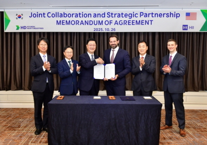 인더뉴스 김용운 기자ㅣHD현대가 미국 최대 방산 조선사인 헌팅턴 잉걸스(Huntington Ingalls Industries)와 함께 미 해군 '차세대 군수지원함' 건조를 통해 한국과 미국 간 군수지원함 분야 협력의 본격적인 여정에 나섰습니다. 27일 HD현대에 따르면, 지난 26일 헌팅턴 잉걸스와 ‘상선 및 군함 설계·건조 협력에 관한 합의 각서(MOA, Memorand…