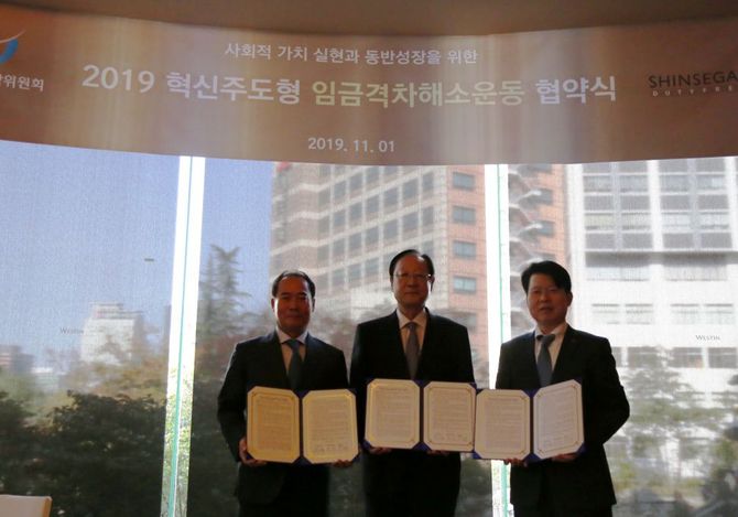 인더뉴스 김진희 기자ㅣ신세계DF가 동반성장위원회와 지난 1일 서울 웨스틴조선호텔에서 ‘혁신주도형 임금격차 해소’ 협약을 체결했다고 4일 밝혔습니다. 이날 진행된 협약식에는 손영식 신세계DF 대표, 권기홍 동반성장위원장을 비롯해 이학섭 개암통상 대표이사 등 총 7개의 협약사 대표이사 등이 참석했습니다. 회사 측은 이번 협약…
