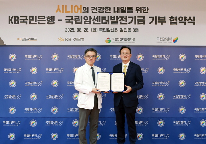 인더뉴스 문승현 기자ㅣKB국민은행(은행장 이환주)은 국립암센터발전기금(이사장 양한광)와 ‘시니어의 건강한 내일을 위한 기부 협약식’을 체결했다고 27일 밝혔습니다. 지난 26일 경기도 고양시에 위치한 국립암센터에서 열린 협약식에는 양한광 국립암센터발전기금 이사장, 이건국 국립암센터 연구소장, 이환주 KB국민은행장, 박병곤 KB국민은행 영업그룹…