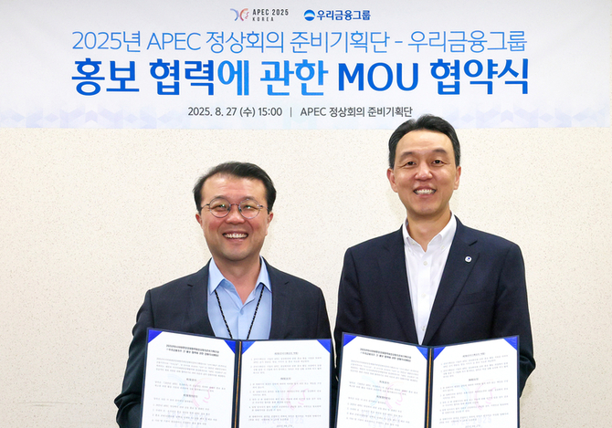 인더뉴스 문승현 기자ㅣ우리금융그룹(회장 임종룡)은 APEC 정상회의 준비기획단과 ‘2025년 APEC 정상회의’ 공식 홍보 협력을 위한 업무협약(MOU)을 체결했다고 28일 밝혔습니다. 이번 협약을 통해 우리금융그룹은 금융기관 중 유일하게 APEC 정상회의 준비기획단과 함께 국내외 홍보 활동을 공동으로 추진합니다. ‘우리나라’와 ‘우리금융그룹’이 ‘AP…