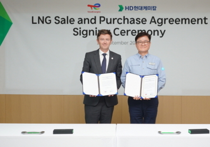 인더뉴스 김용운 기자ㅣHD현대오일뱅크와 롯데케미칼의 합작사인 HD현대케미칼이 글로벌 에너지 기업으로부터 액화천연가스(LNG)를 직도입하며 원가경쟁력 강화에 나섰습니다. HD현대케미칼이 프랑스 종합 에너지 기업인 토탈에너지스(TotalEnergies)와 LNG 장기 직도입 계약을 체결했다고 24일 밝혔습니다. 충남 대산 본사에서 진행된 계약식에는 정…