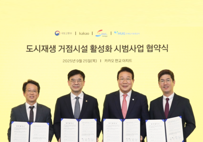 인더뉴스 제해영 기자ㅣ카카오(대표이사 정신아)가 국토교통부, 주택도시보증공사, 부산광역시 동구청과 함께 ‘도시재생 거점시설 활성화 시범사업’을 추진한다고 25일 밝혔습니다. 이날 오후 경기도 성남시 카카오 판교아지트에서 열린 협약식에는 국토교통부 이상경 1차관, 카카오 권대열 ESG위원장, 주택도시보증공사와 부산 동구청 관계자들이 참석했습니다…