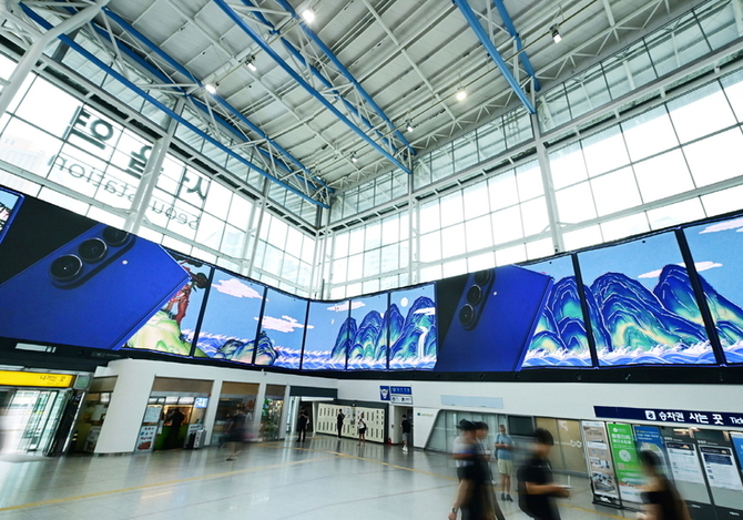 인더뉴스 이종현 기자ㅣ삼성전자[005930]가 서울역을 시작으로 서울 주요 랜드마크에서 '갤럭시 Z 폴드7·Z 플립7'을 주제로 한 초대형 미디어아트 디지털 옥외광고(DOOH)를 선보인다. 삼성전자는 1일부터 서울역에서 역사 내부를 파노라마 형태로 둘러싼 초대형 미디어아트 광고를 시작했다. 총 길이 91m, 높이 5.5m, 면적 610.5㎡의 크기로 몰입도 높은 영상…
