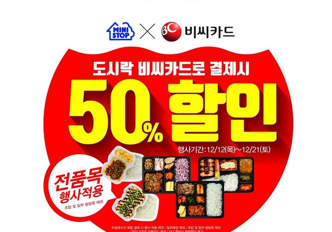 인더뉴스 주동일 기자 | 미니스톱이 도시락 상품을 최소 1700원대부터 판매하는 행사를 진행합니다. 미니스톱은 BC카드로 결제하는 고객에 한해 일부 상품을 제외한 도시락 제품들을 21일까지 50% 할인합니다. 편의점 미니스톱은 BC카드로 결제 시 도시락 상품을 50% 할인한다고 12일 밝혔습니다. 미니스톱은 “위축된 경기와 소비심리를 고려해 편…