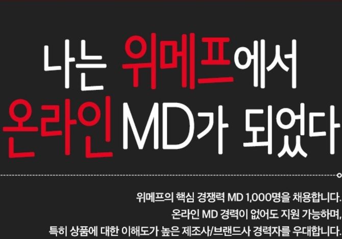 인더뉴스 주동일 기자 | 위메프가 대규모 투자유치에 힘입어 우수인력 채용에 집중할 계획입니다. 위메프는 내년까지 MD 1000명을 신규 채용하고, 경력사원 지원 자격을 확대하기로 했습니다. 위메프는 경력사원 공개채용을 시작으로 2020년 연말까지 MD(상품기획자) 1000명을 신규 채용할 계획이라고 12일 밝혔습니다. 위메프는 MD조직 역량을 성…