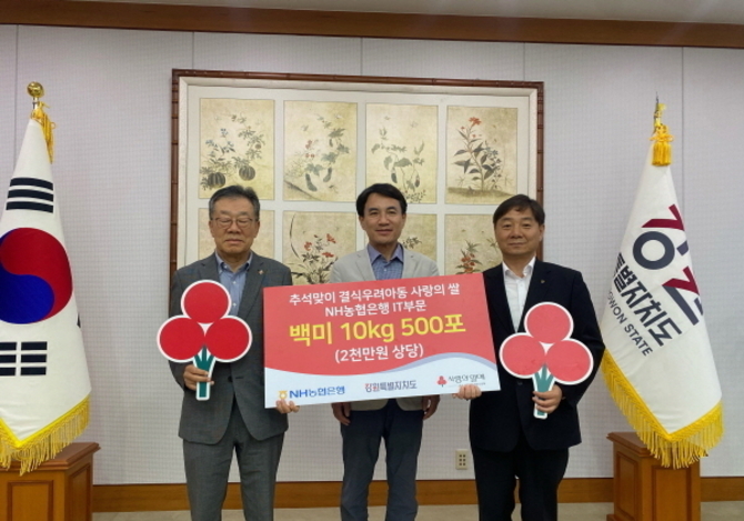인더뉴스 김용운 기자ㅣNH농협은행(은행장 강태영)은 지난 2일 강원특별자치도청을 찾아 도내 취약계층을 지원하기 위해 10kg 쌀 약 500세트(2000만원 상당)를 기부했다고 3일 밝혔습니다. 전달된 쌀은 강원특별자치도 내 18개 시,군 결식 우려아동에게 전달되어 성장기 아이들의 건강하고 따뜻한 한 끼 식사를 위해 제공될 예정입니다. 이번 기부는 추석을 맞이하…