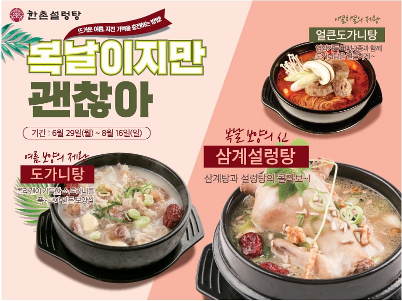 이번 보양식 할인 행사는 오는 8월 16일까지로 행사 기간 동안 한촌설렁탕의 대표 보양식 메뉴인 삼계설렁탕과 도가니탕은 기존 가격보다 2000원, 얼큰도가니탕은 3000원 할인된 금액으로 만나 볼 수 있습니다.