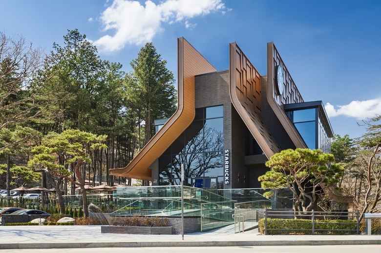 '스타벅스 용인고기동유원지점'은 지하 1층~지상 2층, 총 3개층으로 이뤄진 대규모 독채 매장입니다. 외관이 숲속 산장을 연상시킵니다. 기존 부지에 있던 커다란 나무들과 매장 건물이 조화를 이루도록 설계한 게 특징. 수목이 어우러진 야외 테라스에서 휴식을 취하면서 소나무 숲 속에서 산책을 즐길 수 있습니다.