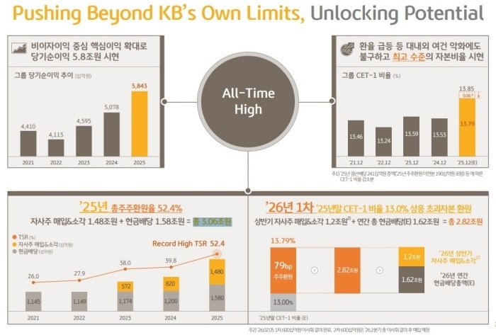 KB금융지주는 이날 실적발표에 앞서 이사회를 열고 2025년 4분기 주당배당금을 전년동기(804원) 대비 2배 증가한 1605원으로 결의했습니다.