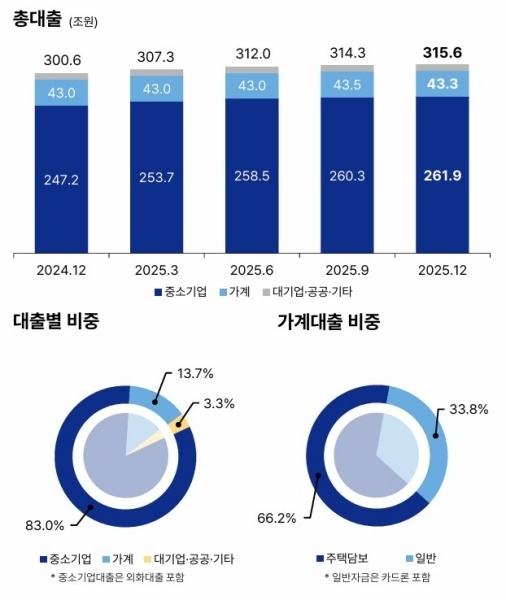 중소기업대출 잔액은 전년말 대비 14조7000억원(5.9%) 증가한 261조9000억원으로 시장점유율은 24.4%에 달합니다. 중소기업금융 리딩뱅크 지위는 더 공고해졌습니다. 작년말 현재 총대출금액은 315조6230억원으로 중소기업대출이 83%를 차지하고 있습니다. 은행 기준 총자산(신탁 포함)은 500조원을 돌파했습니다.