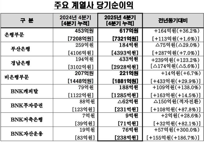 은행 부문의 2025년 당기순이익은 7321억원으로 전년 대비 113억원 증가했습니다. 부산은행은 전년 대비 287억원 증가한 실적을 기록했으며, 경남은행은 경기 둔화 영향으로 174억원 감소했습니다.