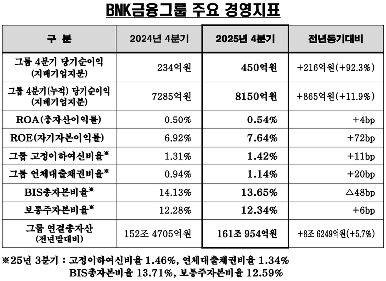 자본 적정성 지표도 안정적인 흐름을 보였습니다. 보통주자본비율은 적정 이익 실현과 위험가중자산 관리 효과로 전년 대비 6bp 상승한 12.34%를 기록했습니다. BNK금융그룹은 보통주자본비율의 지속적인 개선을 통해 향후 주주환원 확대와 신용 리스크 대응 여력을 강화할 계획입니다.