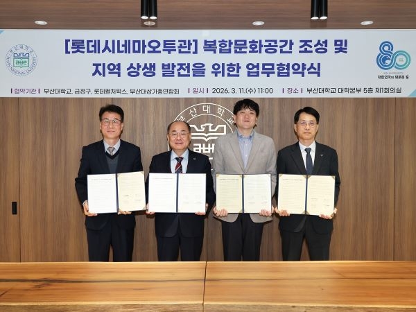 인더뉴스 제해영 기자ㅣ부산대학교는 롯데컬처웍스와 금정구, 부산대상가총연합회와 함께 부산대 지하철역 인근 ‘롯데시네마 오투’ 건물을 복합문화 거점으로 조성하기 위한 4자 업무협약을 11일 체결했다고 밝혔습니다.