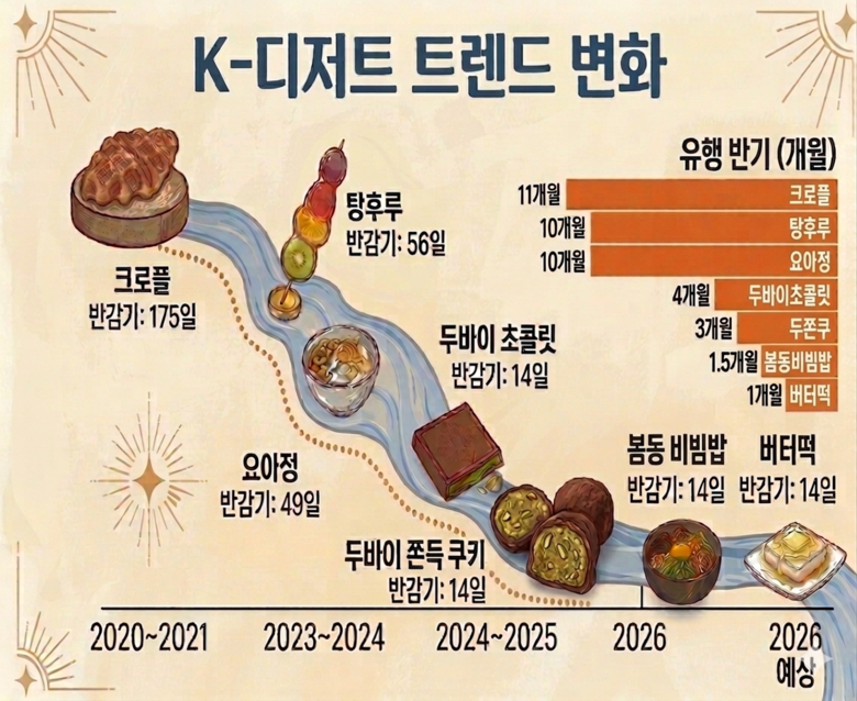 이후에는 유행 수명이 더 짧아졌습니다. 2024년 봄 시작된 ‘두바이 초콜릿’ 유행은 약 4개월간 이어졌고 지난해 말 화제의 중심에 섰던 ‘두바이쫀득쿠키(두쫀쿠)’는 3개월에 그쳤습니다. 두 제품의 유행 반감기는 모두 14일 안팎으로 크로플과 비교하면 유행 지속 기간이 12분의 1수준으로 줄었습니다.
