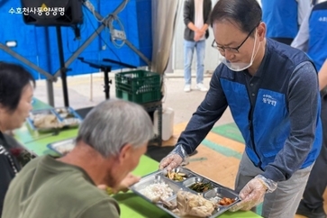 인더뉴스 문승현 기자ㅣ우리금융그룹(회장 임종룡) 자회사 동양생명(대표이사 성대규)은 이달 2일 영등포쪽방상담소를 찾아 독거노인 등 취약계층 노인 300명에 건강식을 대접했다고 10일 밝혔다. 이번 봉사활동은 우리금융 자회사 편입 100일을 맞아 지역사회와 함께하는 기업시민으로서 사회적 책임을 실천하고자 마련됐다. 성대규 동양생명 대표이사는 지난 7월 우리금융 편입 이후 처음으로 현장 봉사활동에 참여했고 회사의 지속가능성과 경쟁력 강화 아이디어를 제안하는 '주니어보드' 젊은 직원들도 함께 했다. 성대규 대표이사는 "동양생명은 우리금융그룹 일원으로 고객은 물론 지역사회와 따뜻한 가치를 나누는 생명보험사로 자리매김하겠다"고 말했다.