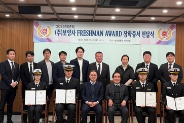 인더뉴스 제해영 기자ㅣ국립한국해양대학교(총장 류동근) 해사대학(학장 김종수)은 지난달 28일 승선생활관 세미나실에서 ‘2025학년도 ㈜보양사 프레시맨 어워드(FRESHMAN AWARD) 장학증서 전달식’을 열고 총 1000만 원의 장학금을 전달받았다고 밝혔습니다. ‘프레시맨 어워드’는 ㈜보양사(회장 김옥정)가 2015년부터 우수한 예비 해기사 양성을 위해 제정한 장학제도입니다. 해사대학 1학년 중에서 책임감과 성실성이 뛰어나고 면학분위기 조성에 기여한 학생을 선발해 장학금을 수여하고 있으며, 현재까지 누적 기부금액은 1억1000만 원에 달합니다. 올해는 해사대학 항해융합학부 김유화 학생, 최정서 학생, 기관시스템공학부 최예준 학생, 해양경찰학부 소찬영 학생, 해사인공지능·보안학부 김규범 학생 등 5명이 장학생으로 선정돼 각각 장학증서와 장학금을 받았습니다. 전달식에 참석한 김옥정 회장은 “해양산업의 미래는 학생 여러분의 도전정신과 전문성에 달려 있다”며 “앞으로도 해사대학과 함께 글로벌 해기사 양성에 힘을 보태겠다”고 말했습니다. 김종수 학장은 “보양사의 꾸준한 관심과 지원이 학생들의 학업 의지를 북돋우는 큰 힘이 되고 있다”며 “산업체와의 긴밀한 협력을 통