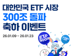 인더뉴스 박호식 기자ㅣ삼성자산운용은 대한민국 ETF시장 순자산 300조원 돌파를 기념해 투자자를 대상으로 한 축하 이벤트를 진행한다고 9일 밝혔습니다. 이번 이벤트는 국내 ETF시장의 성장과정에 함께해 온 투자자들에게 감사의 의미를 전하고, ETF 투자에 대한 관심을 더욱 확대하기 위해 마련했다는 설명입니다. 이벤트는 오는 1월 23일까지 진행됩니다. 이벤트 참여 방법은 간단합니다. ‘대한민국 ETF 시장 300조 돌파 축하 이미지’를 캡처한 후 개인 SNS(인스타그램, 페이스북, 블로그 등)에 업로드하면 됩니다. 이벤트 참여자중 추첨을 통해 총 300명에게 다이소 상품권 1만원권을 증정합니다. 이미지에는 포트래빗 등 삼성자산운용의 캐릭터를 활용해 ETF 시장 300조 돌파를 축하하는 의미를 담았습니다. 삼성자산운용 관계자는 “ETF시장 300조원 돌파는 국내 자본시장의 성장과 개인투자자들의 적극적 투자 참여가 함께 만들어 낸 의미있는 결과”라며 “앞으로도 KODEX ETF는 많은 투자자들이 ETF를 통해 보다 쉽고 합리적인 투자를 할 수 있도록 다양한 상품과 서비스를 선보일 것”이라고 전했습니다.