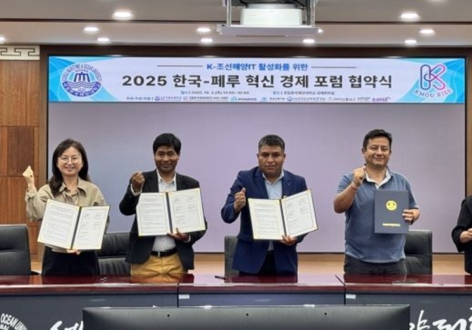 인더뉴스 제해영 기자ㅣ한국조선해양IT학회(학회장 이서정 국립한국해양대 교수)는 지난 2일 국립한국해양대학교 국제회의실에서 ‘2025 한국-페루 혁신 경제 포럼 협약식’을 열고 페루 3개 도시 및 한국페루경제혁신포럼(KPIEF)과 업무협약(MOU)을 체결했다고 8일 밝혔습니다. 이번 협약식에는 페루 칠와와초, 파우카델사라사라, 산타로사 등 3개 도시 대표단…