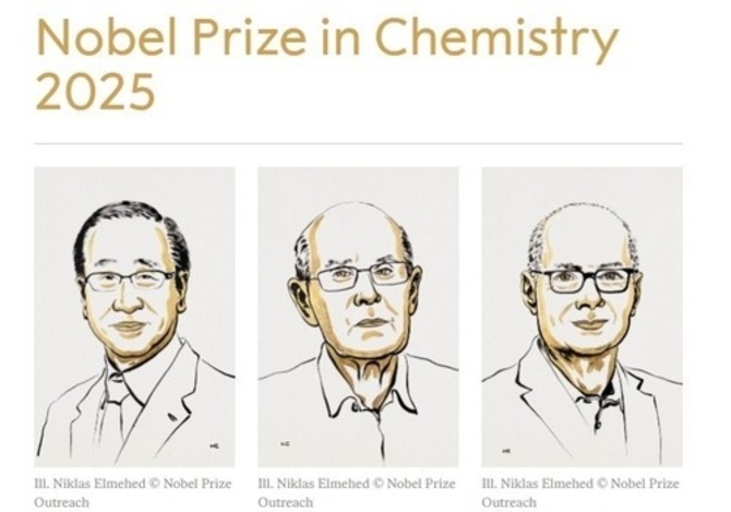 인더뉴스 김용운 기자ㅣ올해 노벨화학상은 '금속-유기 골격체'(Metal-Organic Frameworks·MOF)라는 새로운 분자 구조를 만든 세 명의 대학 교수에게 주어졌습니다. 스웨덴 왕립과학원 노벨위원회는 8일(현지시간) 기타가와 스스무(74) 일본 교토대 교수, 리처드 롭슨(88) 호주 멜버른대 교수, 오마르 M. 야기(60) 미국 UC버클리대 교수를 노벨화학상 수…