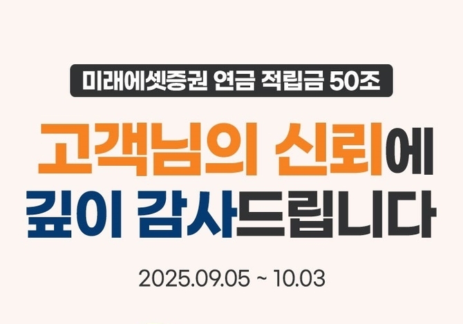 인더뉴스 박호식 기자ㅣ미래에셋증권은 연금 적립금 50조원 시대(8월27일 기준)를 맞아 고객 성원에 보답하기 위해 고객감사 이벤트를 진행한다고 11일 밝혔습니다. 오는 10월3일까지 진행되는 이벤트기간 동안 퀴즈정답을 맞힌 선착순 5만명에게 신세계상품권 5000원이 증정됩니다. 미래에셋증권 개인연금 및 퇴직연금 계좌를 보유한 고객 또는 이벤트기간내 연금…