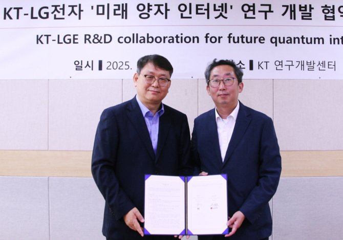 인더뉴스 이종현 기자ㅣLG전자[066570]와 KT[030200] 미래 통신산업 기반기술로 주목받는 양자 인터넷 통신 분야 공동 연구개발을 추진하며 핵심 기술 확보에 나섭니다. LG전자는 최근 서울 서초구 KT우면연구센터에서 제영호 C&M표준연구소장, 이종식 KT 미래네트워크연구소장 등 양사 경영진이 참석한 가운데 양자 인터넷 공동 R&…