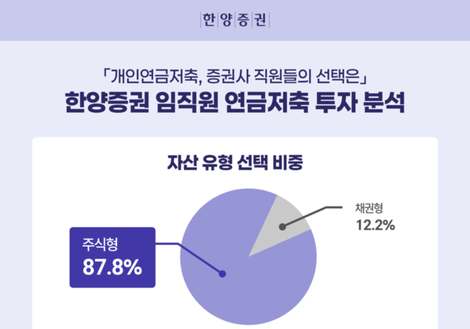인더뉴스 박호식 기자ㅣ한양증권(대표이사 김병철)이 지난 8월 도입한 연금저축펀드 매칭 프로그램을 기반으로 임직원들의 투자성향을 분석한 결과, 임직원 10명중 9명이 안정자산인 채권형보다 위험자산인 주식형펀드를 선택하며 공격적인 투자성향을 보였습니다. 매칭 프로그램은 한양증권 임직원이 선택한 연금저축펀드에 대해 회사가 동일금액(월 10만원)을 지…