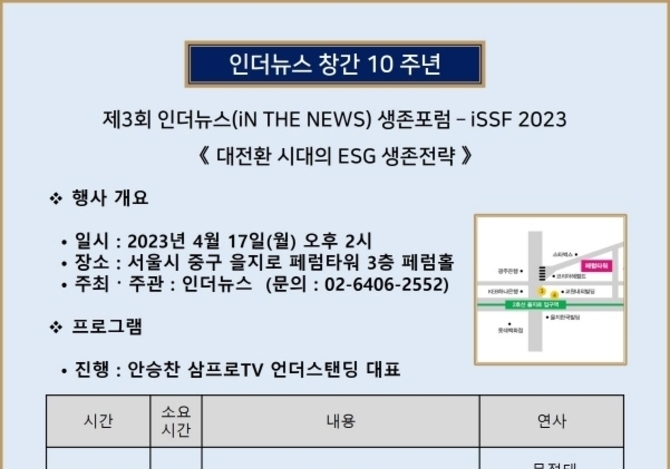 인더뉴스 김용운 기자ㅣ올해로 창립 10주년을 맞이하는 인더뉴스가 17일 오후 2시 서울 중구 을지로 페럼타워 3층 페럼홀에서 ‘인더뉴스 생존전략포럼-대전환 시대 ESG 생존전략’(이하 인더뉴스 생존포럼)을 개최합니다. 인더뉴스 생존포럼은 지난 2019년 처음 개최했으며 해를 이어오며 개인과 조직, 기업과 국가, 나아가 인류의 윤택한 생존을 위한 대안을 모색…