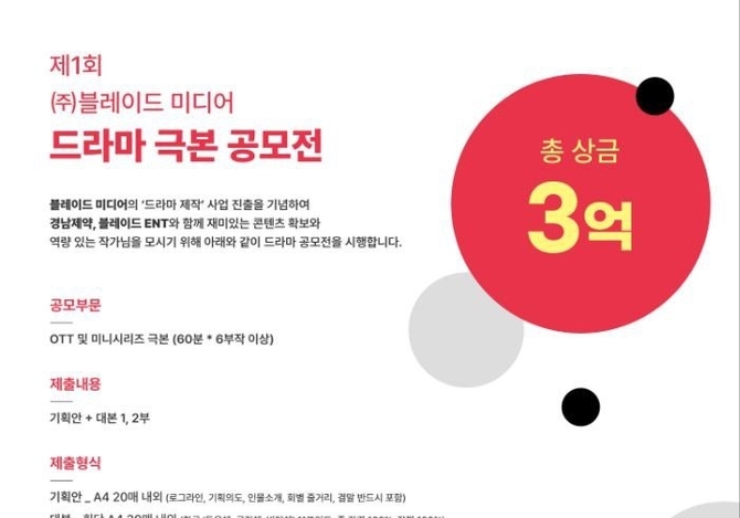 인더뉴스 김대웅 기자ㅣ블레이드미디어가 드라마 제작사업 진출을 기념해 오는 17일부터 총상금 3억원 규모의 드라마 극본 공모전을 경남제약, 블레이드엔터테인먼트와 함께 개최한다. 블레이드미디어는 경남제약 최대주주인 블레이드엔터테인먼트의 자회사로, 본격적인 드라마 제작사업에 나서며 역량있는 작가들의 극본을 발굴하기 위해 이번 공모전을 기획했다.…