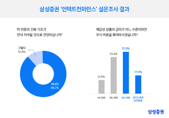 인더뉴스 김용운 기자ㅣ국내 투자자들 대다수가 올해 미국 연준의 긴축 기조가 완화될 것으로 전망했습니다. 금리 인하 시기는 오는 3분기로 보는 시각이 우세했습니다. 24일 삼성증권에 따르면 지난 12일 진행한 삼성증권 '언택트 컨퍼런스' 설문 참여자 9629명을 대상으로 한 조사에서 미국 연준의 긴축 기조가 연내 지속될지에 대한 전망에 '아니다'라고 응답한 비율…