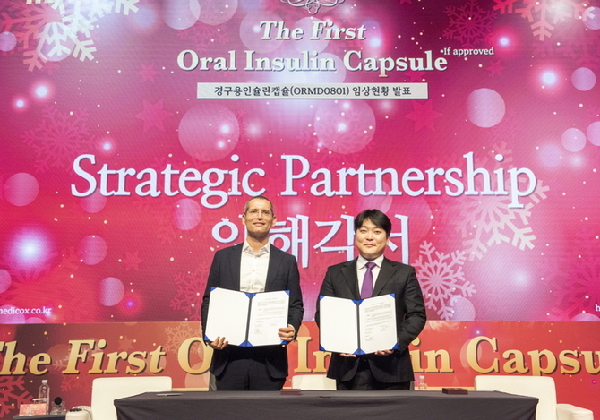 인더뉴스 양귀남 기자ㅣ메디콕스는 나스닥 상장사 오라메드 파마슈티컬스(Oramed Pharmaceuticals, 이하 오라메드)와 지난달 29일 ‘경구용 인슐린 캡슐(ORMD0801) 임상 현황’ 설명회에서 양사 간 투자 및 한국, 미국 기관 투자 유치를 위한 전략적 업무협약을 체결했다고 2일 밝혔다. 이번 MOU를 통해 양사는 상호 투자와 더불어 한국과 미국 각 기…