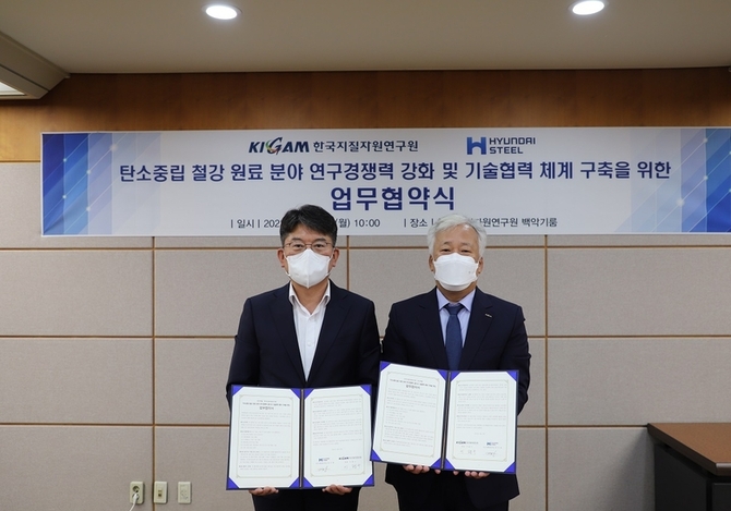 인더뉴스 홍승표 기자ㅣ현대제철[004020]은 제철소 탄소중립을 위해 한국지질자원연구원과 ‘제철소 원료의 최적 활용 및 운영 기술 개발 협력을 위한 업무 협약’를 체결했다고 24일 밝혔습니다. 한국지질자원연구원은 광물 자원분야에 있어 전문 연구 인력과 인프라를 보유한 국내 유일의 전문 연구기관입니다. 광물자원연구본부·자원활용연구본부·기후변화…