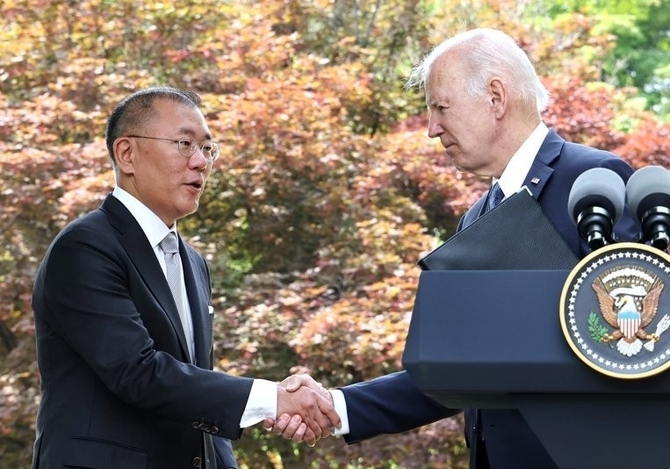 인더뉴스 홍승표 기자ㅣ현대자동차[005380]그룹이 오는 2025년까지 미국에 로보틱스 등 미래 먹거리 분야에 50억달러를 추가 투자를 추진하겠다고 밝히며 미국 신규 투자 규모를 총 105억달러로 늘렸습니다. 23일 현대차그룹에 따르면 지난 22일 오전 정의선 현대차그룹 회장은 서울 그랜드하얏트 호텔에서 열린 조 바이든 미국 대통령과의 면담에서 미국 신규 투…