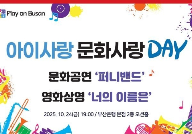 인더뉴스 제해영 기자ㅣBNK금융그룹(회장 빈대인)은 지역 대표 문화행사인 ‘Play on BNK(시민과 함께 즐기다)’ 10월 공연으로 어린이 400여 명을 초청해 ‘아이사랑 문화사랑’ 행사를 오는 24일 오후 7시 부산은행 본점 2층 오션홀에서 개최한다고 22일 밝혔습니다. ‘Play on BNK’는 지역 주민들에게 다양한 문화 경험을 제공하기 위한 무료 예술 프…