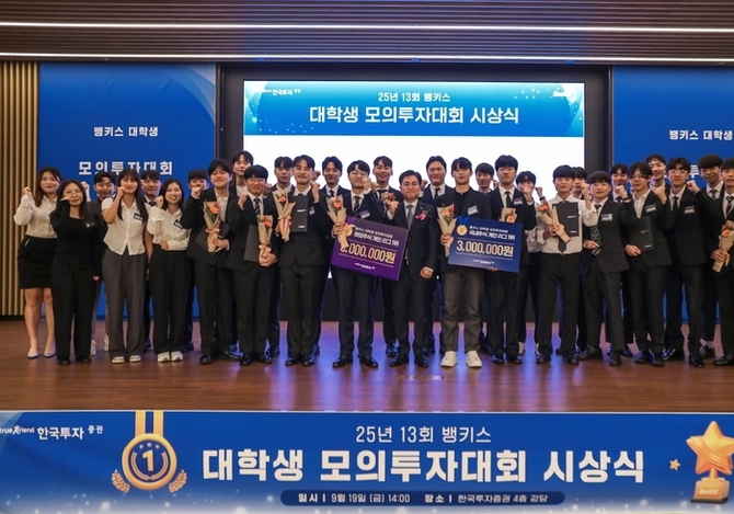 인더뉴스 박호식 기자ㅣ한국금융지주 자회사 한국투자증권(사장 김성환)은 지난 19일 서울 여의도 한국투자증권 본사에서 ‘뱅키스 대학생 모의투자대회’ 시상식을 진행했다고 23일 전했습니다. 이번 대회는 7월7일부터 8월8일까지 5주간 진행됐으며, 국내외 대학생 4631명이 참가했습니다. 누적 수익률이 가장 높은 개인 참가자 10명과 6개 팀이 최종 수상자로 선…