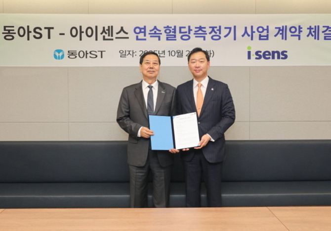인더뉴스 문정태 기자ㅣ동아에스티(대표이사 정재훈)는 아이센스(대표이사 차근식·남학현)와 연속혈당측정기 ‘케어센스 에어(CareSens Air)’ 전문가용 판매 계약을 체결했다고 21일 밝혔습니다. 협약식은 서울 동대문구 동아에스티 본사에서 진행됐습니다. 이번 협약은 동아에스티의 병·의원 영업 네트워크와 아이센스의 진단기기 기술력을 결합해 의료 현…