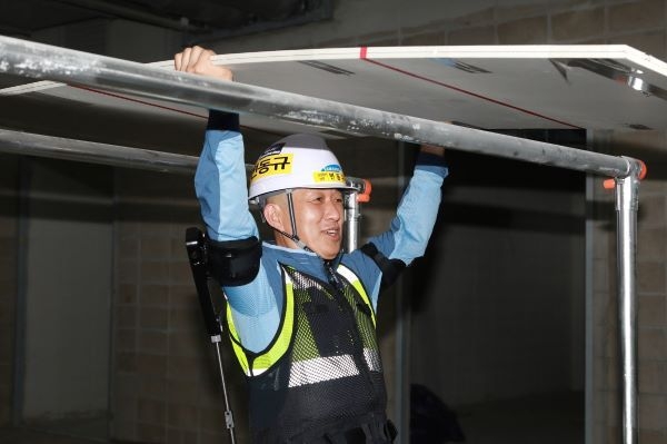 현대자동차그룹 로보틱스랩의 웨어러블 로봇 ‘엑스블 숄더(X-ble Shoulder)’는 어깨 근력을 보조해 근로자의 부담을 줄여줍니다. 천장 도장, 배관, 석고보드 시공 등 장시간 상부 작업에 효과적이며, 행사에서는 근로자들이 직접 착용해 성능을 확인했습니다.