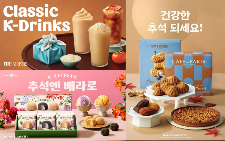 배스킨라빈스는 추석 한정 ‘아이스 경단’ 2종과 선물세트를 내놓았습니다. 흑임자·인절미 맛 아이스크림을 떡으로 감싸고 고물을 입혀 식감과 풍미를 더했습니다. 직영점에서는 ‘수정과·식혜 K-Drink’, ‘인절미 모찌’, ‘청사초롱 케이크’ 등 협업 디저트도 만나볼 수 있습니다.