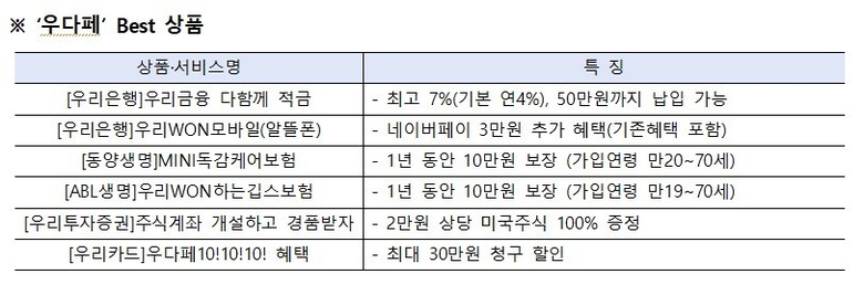 우다페에는 은행·보험·증권 등 7개 계열사가 총 32종의 특판상품과 서비스를 선보입니다. 먼저 우리은행은 최근 금융권에서 보기 드문 7% 적금상품을 내놓았습니다. 기본금리 4%에 거래실적에 따른 우대금리 3%를 더해 최고 연 7% 금리를 제공하는 '우리금융 다함께 적금' 입니다. 가입기간 12개월, 월최대 50만원까지 납입하는 자유적금 상품입니다. 현재 은행권에서는 최고금리입니다.