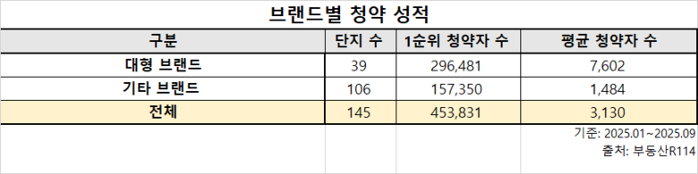 반면 10대 건설사를 제외한 기타 브랜드 단지는 106개로 전체의 73%를 차지했지만, 1순위 청약자는 15만7350명(34.6%)에 그쳤습니다. 단지당 평균 청약자 수를 보면 메이저 브랜드는 약 7602명, 기타 브랜드는 1484명 수준으로 무려 5배 이상 격차가 벌어졌습니다.