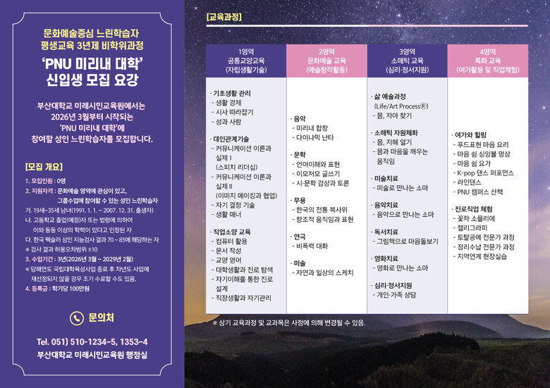 인더뉴스 제해영 기자ㅣ부산대학교가 성인 느린학습자를 위한 문화예술 중심 맞춤형 평생교육 과정 ‘PNU 미리내대학’의 2026학년도 신입생을 모집합니다. 부산대 미래시민교육원은 오는 17일부터 21일까지 신입생 방문 접수를 진행한다고 7일 밝혔습니다.