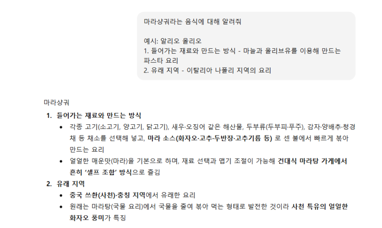 예시를 프롬프트에 추가하면 답변의 형식을 고정하거나 AI의 성능을 높일 수 있습니다. '마라샹궈는 음식에 대해 알려줘'라는 프롬프트와 함께 '예시: 알리오 올리오 / 마늘과 올리브유를 이용해 만드는 파스타 요리 / 이탈리아 나폴리 지역의 요리'와 같은 예시 프롬프트를 넣으면 이와 같은 형식으로 답변을 정리해 줘 사용자가 알아보기 쉬우며 AI 또한 해당 형식에 맞는 정보를 찾으면 되기에 보다 정확하고 질 높은 답변을 생성할 수 있습니다.