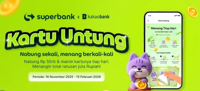 12일 카카오뱅크에 따르면 슈퍼뱅크는 최근 신상품 'Kartu Untung(카르투 언퉁)'을 선보였습니다. '행운카드'라는 의미를 지닌 카르투 언퉁은 고객이 5만루피아(한화 5000원)를 저축하면 슈퍼뱅크앱에서 매일 복권 같은 캐시백 경품을 뽑을 수 있는 서비스입니다.