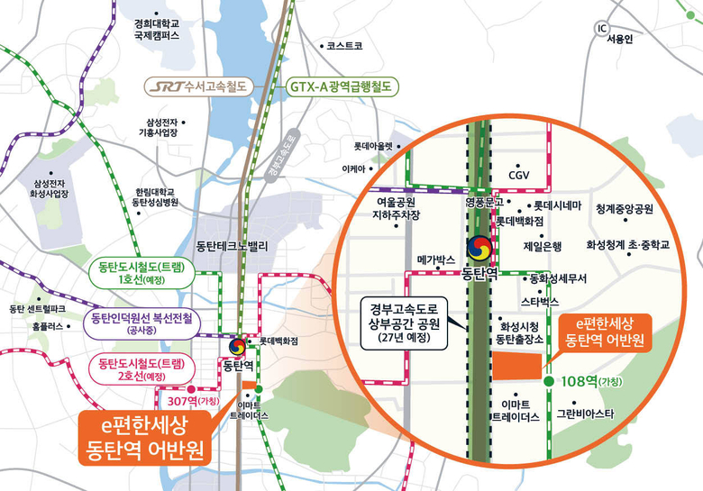 e편한세상 동탄역 어반원은 GTX-A와 SRT가 정차하는 동탄역을 도보로 이용할 수 있는 역세권 입지가 가장 큰 강점으로 꼽힙니다. GTX-A를 이용하면 동탄역에서 수서역까지 약 21분 만에 이동할 수 있어 서울 접근성이 뛰어납니다. 단지 인근 버스정류장을 통해 강남, 판교, 서울역, 인천·김포공항 등 주요 지역으로의 이동도 수월합니다.
