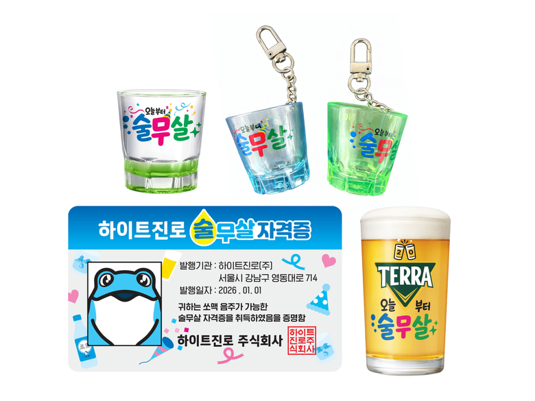 이와 함께 술자리 ‘첫 건배’ 기념 인증샷을 위한 ‘술무살 전용잔’과 전용잔 디자인을 반영한 ‘미니 키링’도 출시합니다. 하이트진로의 인기 굿즈에 술무살 축하 문구를 넣은 참이슬 술무살 컬러잔 6종, 테라 술무살 변온잔, 술무살 미니 키링 2종을 활용해 전국 주요 상권에서 증정행사를 진행합니다.
