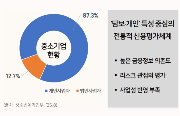 신용정보원 전필수 부장은 "담보·개인 특성 중심의 전통적 개인사업자 신용평가체계는 금융정보 의존도가 높고 리스크 관점의 평가가 이뤄져 사업성이 충분하게 반영되지 않고 있다"고 지적합니다.