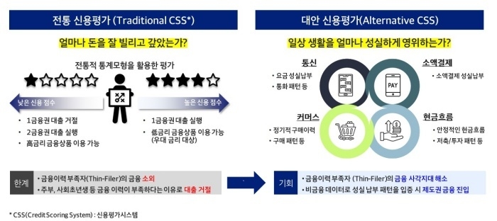 최척 부장은 "이들을 포용할 수 있는 평가체계 개선이 필요하다"며 "개인신용평가모형에서 통신·공공요금 납부내역 등 일부 비금융정보를 신용평가에 반영하고 있지만 데이터 분석의 한계, 정보제공기관의 협조문제 등으로 비금융정보 추가 발굴·활용이 어렵다"고 말했습니다.