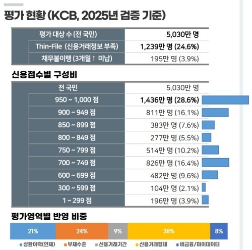 노년층(387만명), 청년(331만명), 주부(271만명) 등 신용거래정보부족자 이른바 씬파일러(Thin filer)에게는 2024년말 기준 평균 710점 수준의 신용점수가 부여됐습니다.